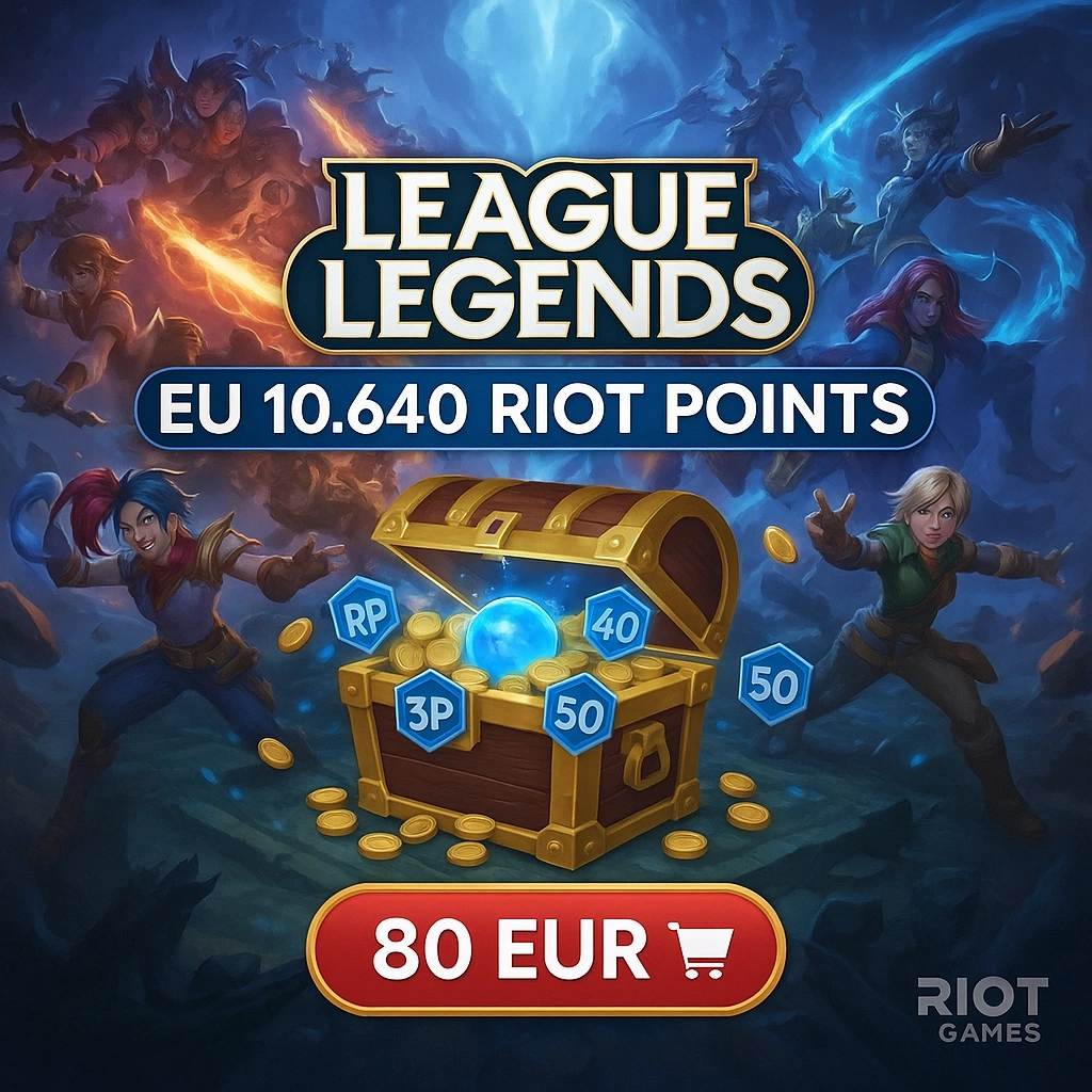 LoL 10640 RP EU West – 80 EUR paketi, League of Legends oyuncuları için en büyük Riot Points (RP) paketidir. Bu dijital kod ile oyun içindeki tüm premium içeriklere kolayca ulaşabilirsin: